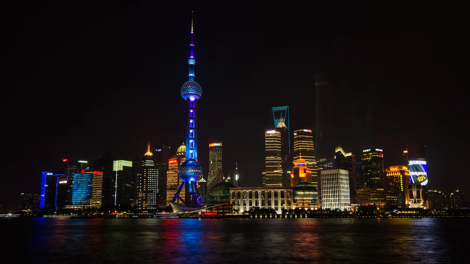 Looking across the Huangpu River in Shanghai to the collection of modern skyscrapers on the other side.