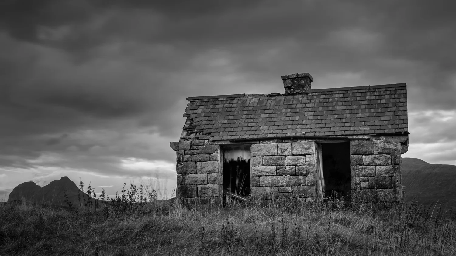 With the roof beginning to fall away at one end, this derelict cottage stands alone, Suilven keeping it company in distance.
