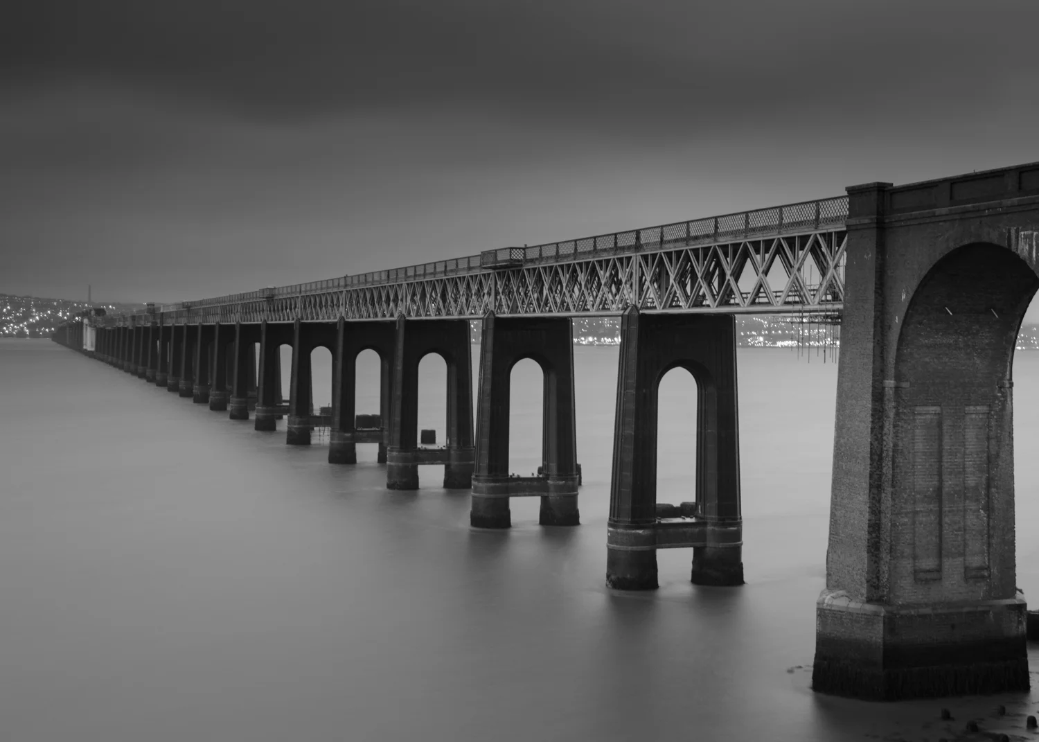 The Tay Rail Bridge standing strong in the silvery Tay with the City of Discovery in the background.