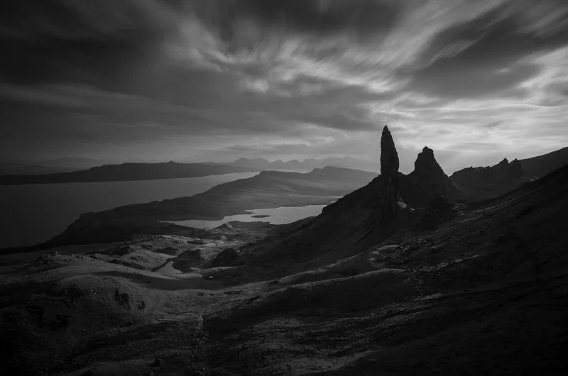 This was taken in November when we visited Skye. We had walked up and past the other (very few) tourists and I set the camera beyond the Auld Man looking south over Loch Leathan and across Skye.