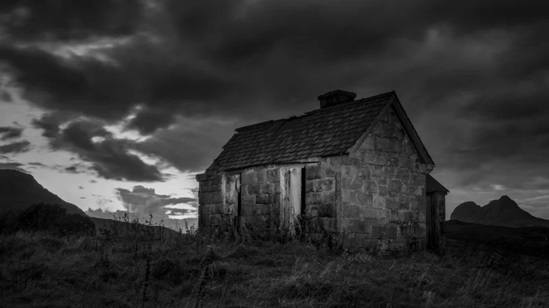 We photographed this auld derelict cottage as the sun was setting with Suilven in the distance.