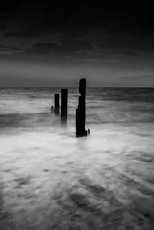 It was taken early one morning on the beach near Aldeburgh looking out to sea beyond the silhouette of four groynes standing firm as the waves sweep around them.