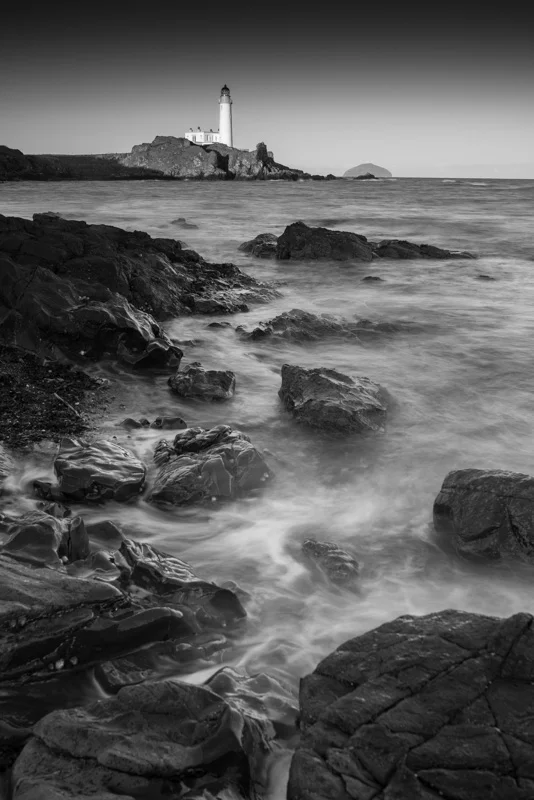 Unfortunately by the time I took this photograph the colour was largely gone but I think mono works well with the dark rocks, the movement in the water and the lighthouse basking in the morning sun.